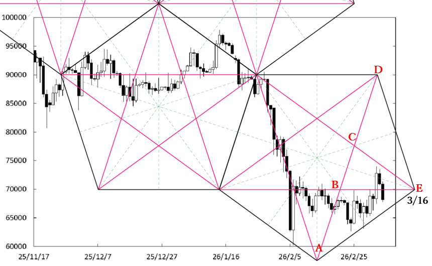 下値でのもち合いから上放れたと思われたビットコインだが、先週末にかけて再び下落。下値支持線と期待されたBEラインを割り込んだ。故に、堅調な展開を維持するのであれば、BEラインを超えていくことが求められる。そうなれば、真横に新しいペンタゴンが描き足される。