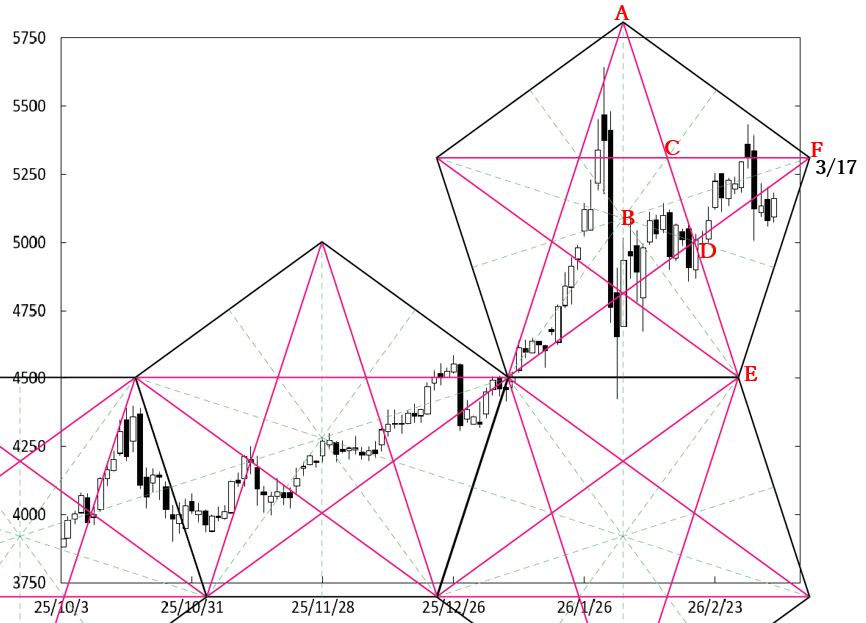 堅調な展開を維持するのであれば、右肩上がりで下値支持線として存在しているAEラインを割り込むことなく推移していくことが求められる。逆に、割り込むと、右下に新しいペンタゴンが描き足され、弱気が広がることになる。