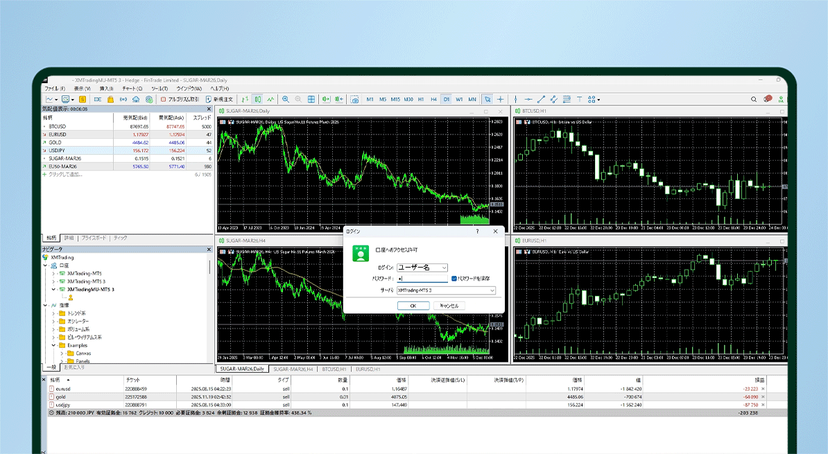 MetaTrader 5 (MT5) にログインしてXMTradingの取引口座をプラットフォームに接続すると、高度なチャート機能、複数の時間足、詳細な市場分析、そして向上したパフォーマンスにあらゆる端末からアクセスできるようになります。